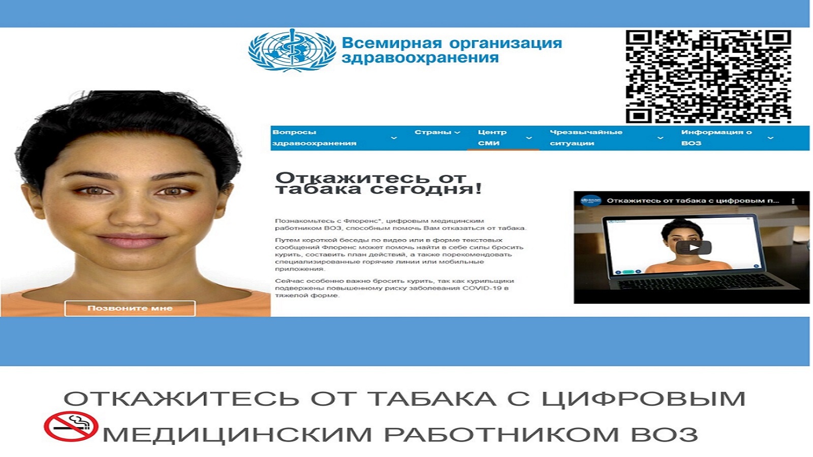 ГАУЗ «Республиканский центр общественного здоровья и медицинской профилактики информирует, что Всемирная организация здравоохранения (ВОЗ) создала специального цифрового медицинского работника с искусственным интеллектом Флоренс для помощи людям, которые хотят бросить курить. Предлагаем разместить на официальных сайтах и в социальных сетях медицинских учреждений ссылку на голосового помощника Флоренс по отказу от курения «Откажись от табака сегодня». Ссылка к веб-сайту Всемирной организации здравоохранения: