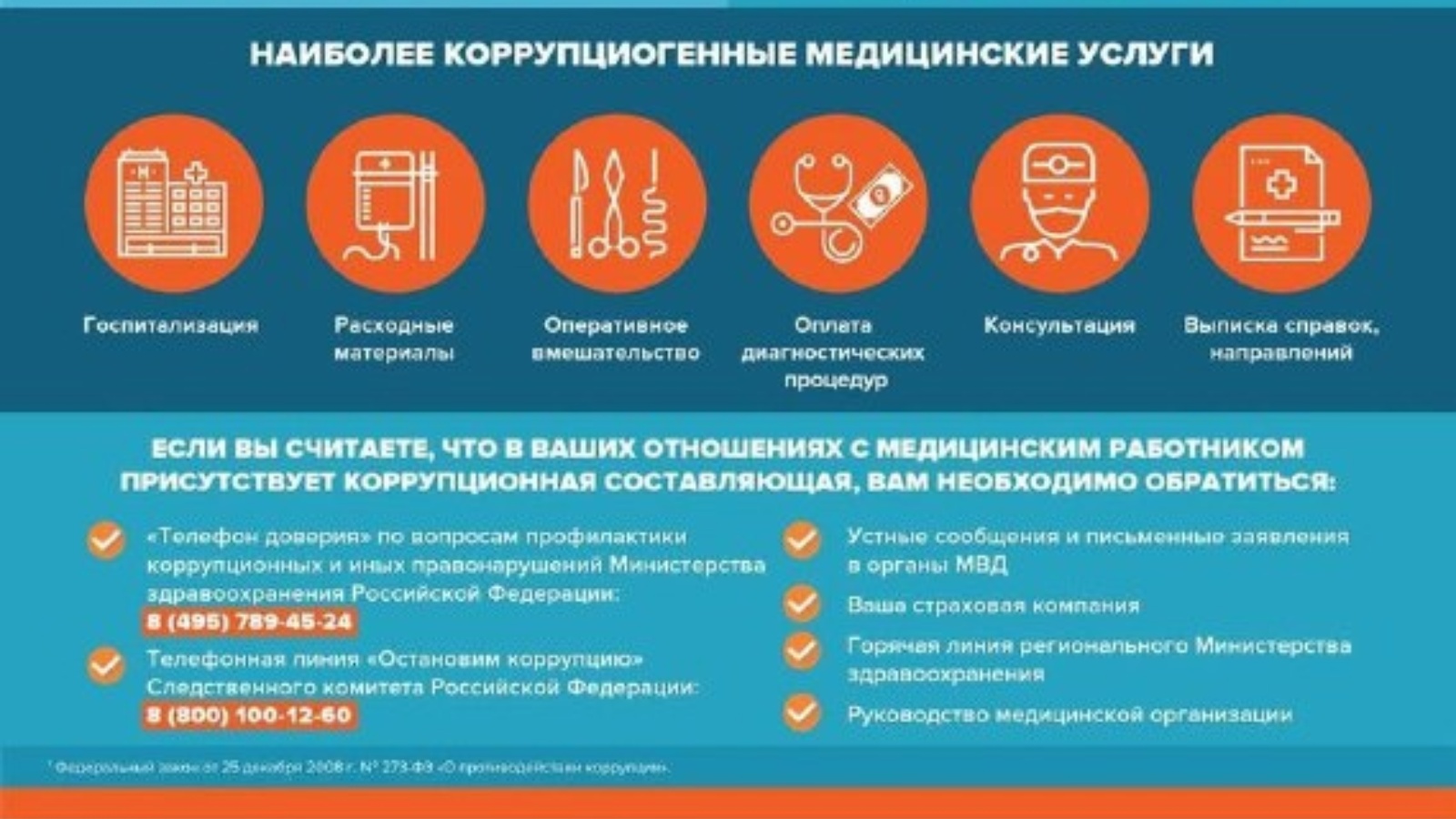 Министерством здравоохранения Республики Татарстан реализуется Антикоррупционная программа, целью которой является выявление и устранение коррупции, создание условий, препятствующих коррупции, формирование в обществе нетерпимого отношения к коррупции.
